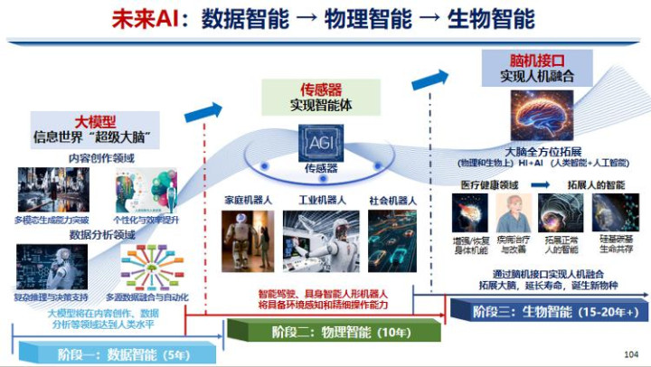 当前,人工智能已深度融入人类社会,尤其在生物医学领域推动着基因解码、药物研发及精准诊疗的革命性突破。展望未来,AI将沿“数据智能→物理智能→生物智能”路径演进:数据智能依托算力与算法挖掘信息价值;物理智能赋予机器感知与行动能力;而生物智能将通过脑机接口实现人机智能深度融合,最终构建无创脑际通信——以神经信号直连替代传统通讯(如电话/微信),成为生命体间信息自由交互的终极载体。